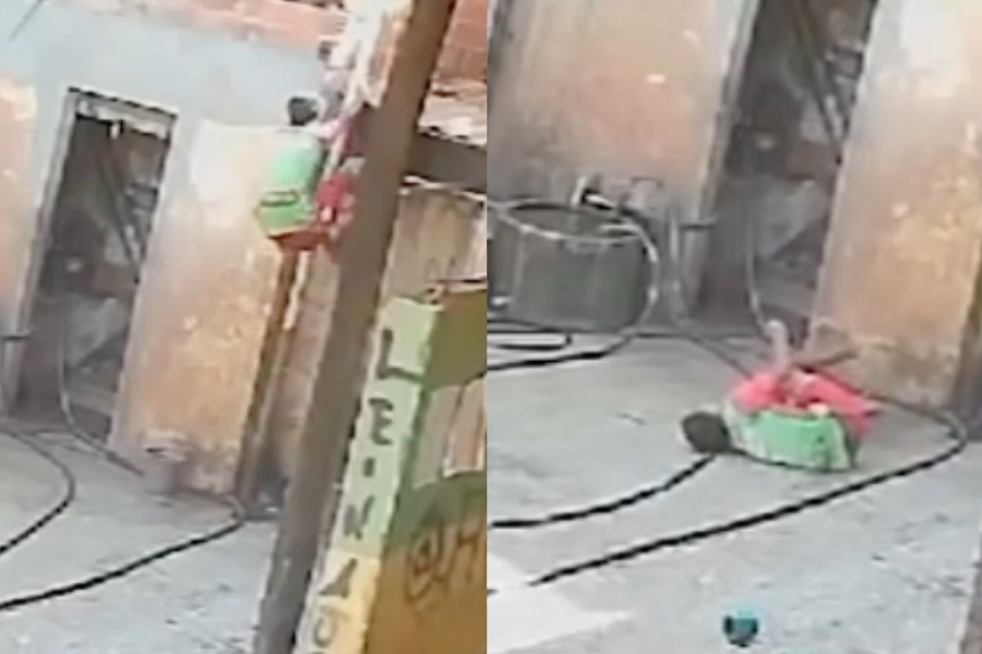 As câmeras de segurança do estabelecimento registraram o momento do incidente. Logo após a queda, um homem correu e socorreu a vítima rapidamente.