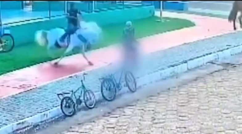 Câmeras de segurança registraram o momento em que uma idosa de 75 anos foi atropelada por um cavalo enquanto caminhava na calçada de uma praça pública no município de Porto Franco, no sul do Maranhão. O animal, montado por um jovem, se descontrolou e atingiu a mulher, que sofreu fratura na clavícula e outros ferimentos pelo corpo.