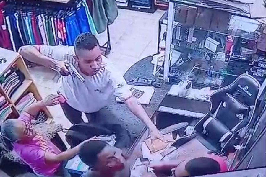 O crime foi registrado por câmeras de segurança do estabelecimento. As imagens mostram dois assaltantes invadindo a loja e rendendo o dono e os clientes de maneira violenta. Um dos criminosos, vestido com um uniforme escolar, estava armado.