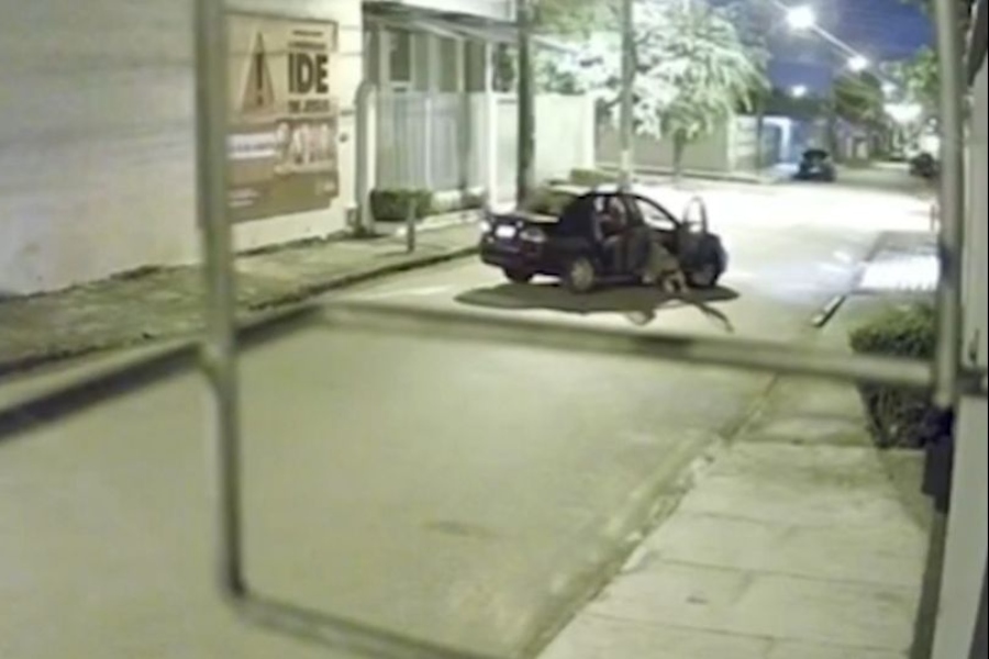 Patrícia Castro tenta entava tirar seu pai, diagnosticado com Alzheimer, do veículo da família. Ela caiu no chão durante a ação criminosa. As imagens, capturadas por uma câmera de segurança, foram divulgadas nesta sexta-feira (5).