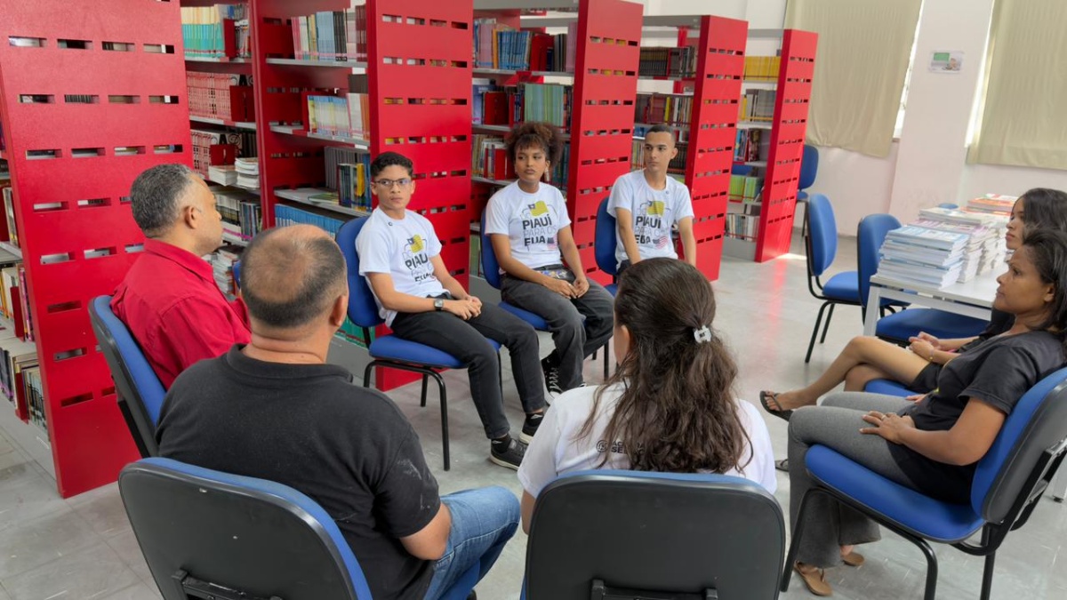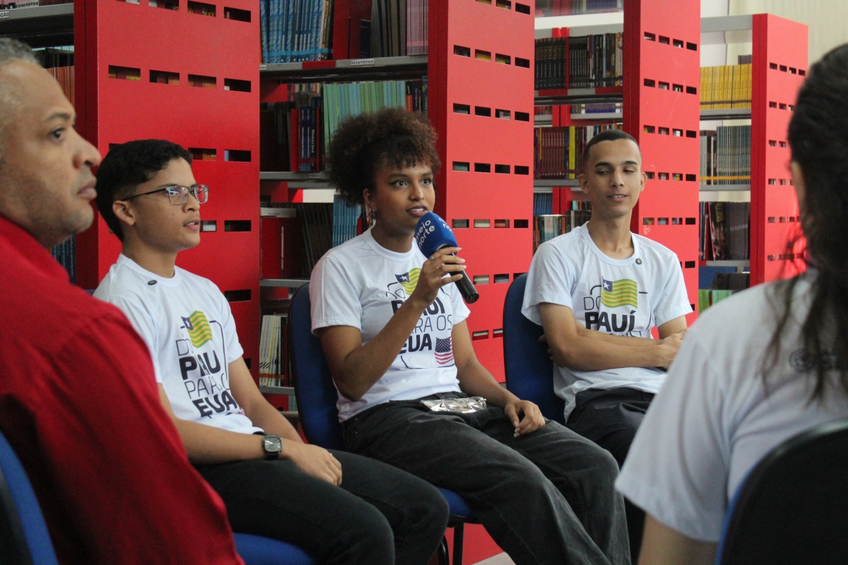 É na biblioteca da escola que a introdução de ao encontro acontece. Reunidos em uma roda de conversa, Ana Isabelly, Kelson e Gustavo assumem o centro da atenção ao compartilhar descobertas, aprendizados e novas perspectivas construídas durante o intercâmbio realizado em novembro do ano passado, em Massachusetts (EUA), após o Seduckathon, uma maratona de tecnologia promovida pelo Governo do Estado.
