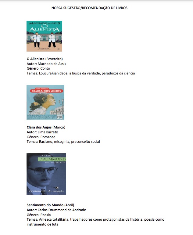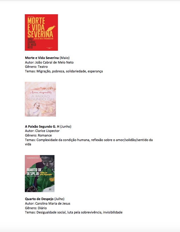 Diante do exposto, vimos sugerir a adoção, tendo por objetivo reforçar o repertório sociocultural da “galera”, de uma lista de livros para o Enem/2026 (um por mês), contemplando autores clássicos e contemporâneos da literatura brasileira, bem como os mais distintos gêneros.