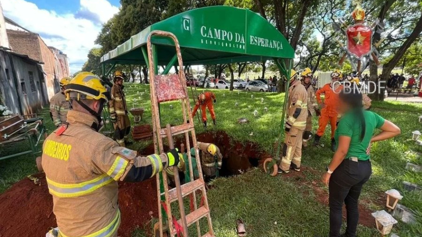 No início da tarde deste sábado (20), cerca de 10 pessoas caíram em uma cova depois da laje de uma sepultura desabar no Cemitério Campo da Esperança de Taguatinga, no Distrito Federal. O Corpo de Bombeiros (CBMDF) foi acionado para atender cinco pessoas feridas no incidente, incluindo dois funcionários do cemitério.