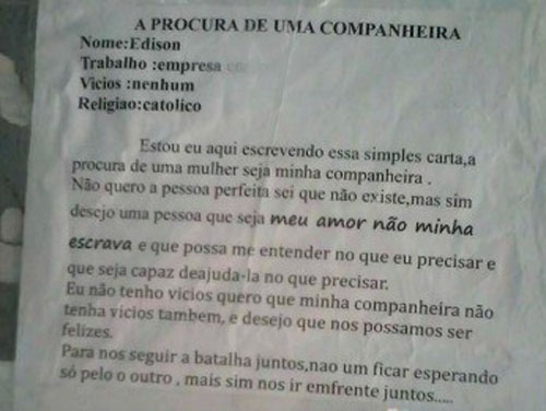 Essa é a segunda vez que ele faz isso. E na outra também não teve sucesso. Ele diz, no cartaz, que é católico e não possui nenhum vício. "Não quero uma pessoa perfeita, sei que não existe, mas desejo uma pessoa que seja meu amor, não minha escrava, e que possa me entender no que precisar e que seja capaz de ajudá-la no que precisar", diz trecho do comunicado