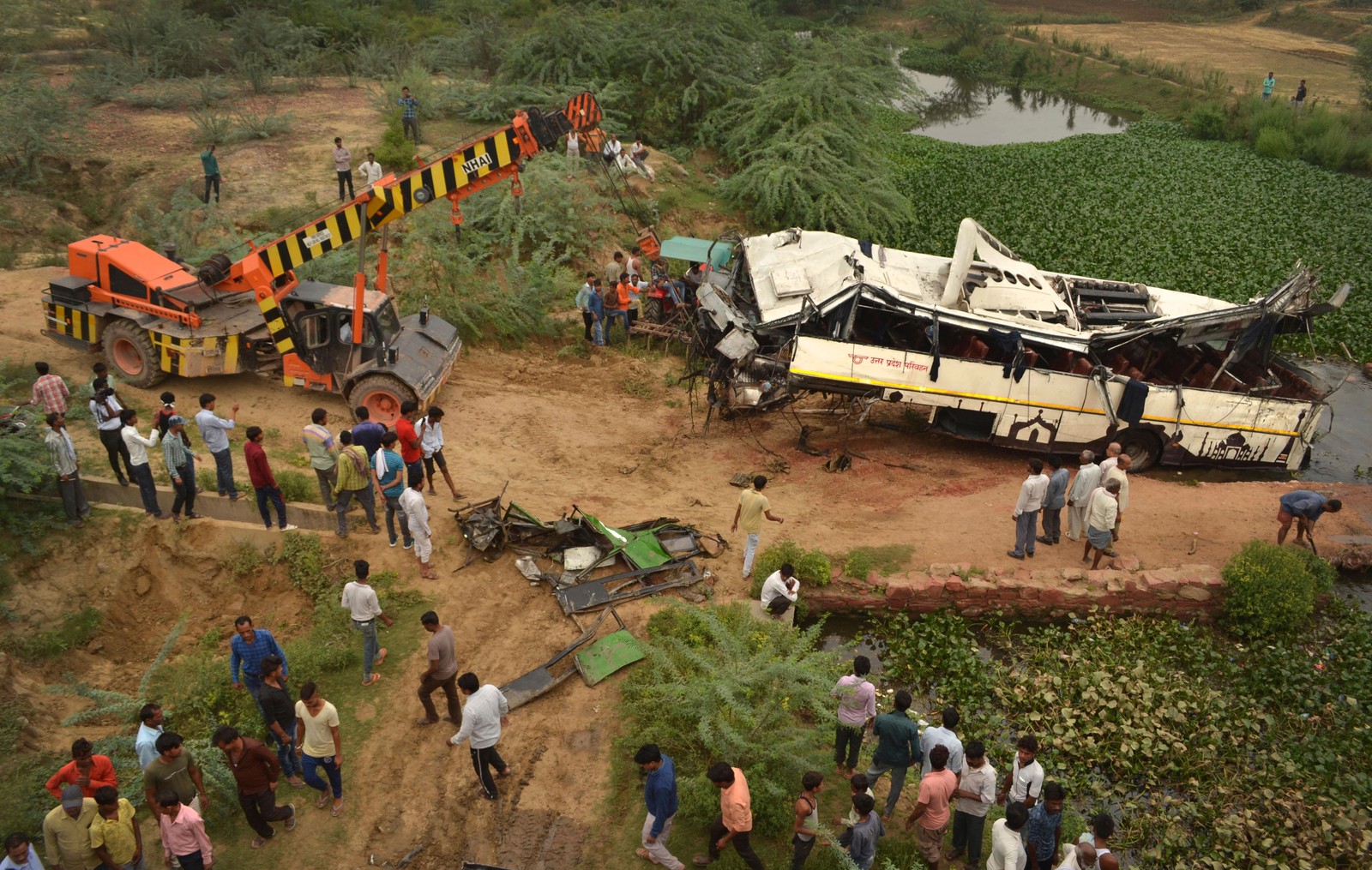As autoridades acreditam que o motorista dormiu e o ônibus de dois andares bateu em uma divisória, antes de cair em um vão entre dois viadutos na rodovia Yamuna, que liga Delhi a Agra. O veículo caiu em um rio que fica mais de 12 metros abaixo da rodovia. A destruição do segundo andar do ônibus e o fluxo do rio dificultam os trabalhos de resgate.