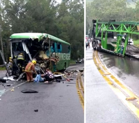 Segundo a Polícia Rodoviária Federal (PRF), a carreta estava na descida da serra e fez uma curva à direita, quando o reboque fez um “L” e invadiu a pista contrária, atingindo o ônibus. Chovia no momento do acidente.