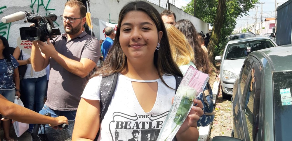 Maria Eduarda Levino, de 14 anos, é estudante do primeiro ano do ensino médio. Ela ganhou uma flor quando foi pegar a mochila, que estava guardada na sala da diretoria.