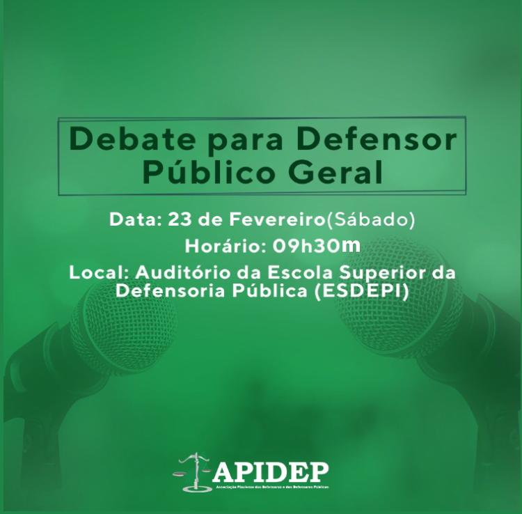 A Associação Piauiense das Defensoras e Defensores Públicos (APIDEP) realizará, neste sábado (23), às 09:30min, no auditório da Escola Superior da Defensoria Pública (ESDEPI), um debate entre os Defensores Públicos candidatos ao cargo de Defensor Público-Geral.