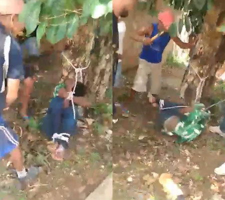 O supeito que não teve a identidade revelada foi reconhecido por uma senhora que teria sido vítima de um assalto cometido por ele. Ele foi localizado próximo a uma creche, teve as mãos e as pernas amarradas com uma corda e ficou preso em uma árvore, enquanto homens chutam e dão socos contra ele.