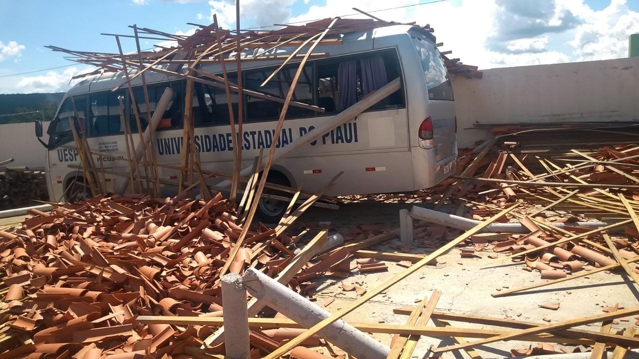 Após forte chuva registrada no fim de semana, parte da estrutura do teto da Universidade Estadual do Piauí (Uespi), do campus Professor Barros Araújo, em Picos, desabou na segunda-feira (18), e atingiu um micro-ônibus da instituição. Felizmente, ninguém saiu ferido do acidente.