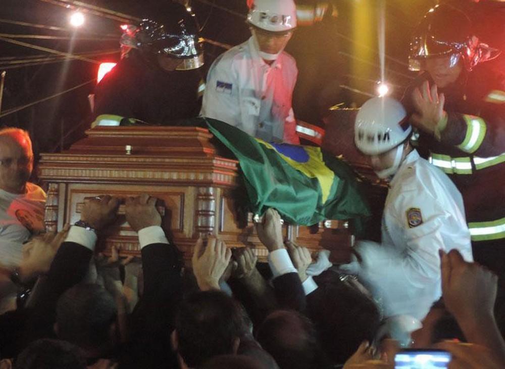 O caixão, coberto pela bandeira do Brasil, foi levado em carro aberto do Corpo de Bombeiros até a entrada do cemitério. Em cima do carro, seguiram também quatro dos cinco filhos de Campos, a viúva, Renata Campos, a vice na chapa do PSB, Marina Silva, e o candidato ao governo pernambucano pelo PSB, Paulo Câmara. O caminho do caixão dentro do cemitério está foi feito com um veículo especial.