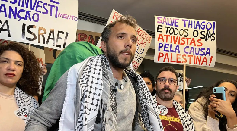 Ao desembarcar no Aeroporto Internacional de Guarulhos, em São Paulo, Thiago foi recebido por um grupo de militantes pró-Palestina. Os apoiadores da causa o cercaram com cartazes de apoio ao país e bandeiras.