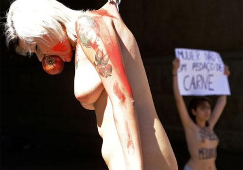 Nua e com uma maçã na boca, a ativista Sara Winter foi suspensa por ganchos em suas costas no ato nomeado como "Mulher não é um pedaço de carne".