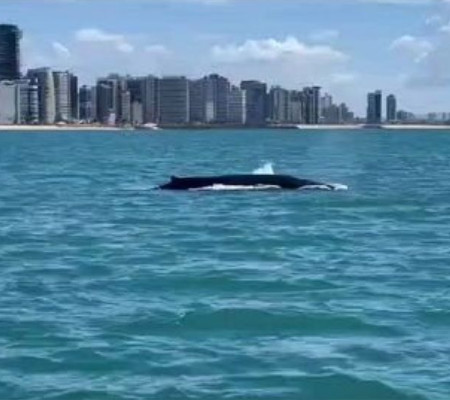 Uma baleia da espécie jubarte foi avistada por volta das 13 horas deste sábado (17), na costa de Fortaleza. O registro do animal nadando pelas águas próximas ao Iate Clube, no Mucuripe, foi compartilhado por curiosos nas redes sociais.