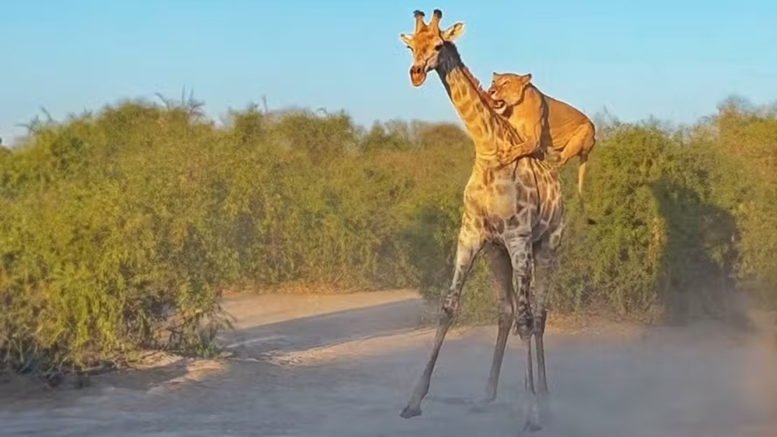 Os leões, que operam em coordenação, imediatamente seguiram a girafa. Antes que ela pudesse percorrer uma distância significativa, outro leão conseguiu agarrar suas costas, tentando atingir seu pescoço. Embora não tenha conseguido uma pegada firme, a girafa tentou sacudi-lo com movimentos do pescoço.