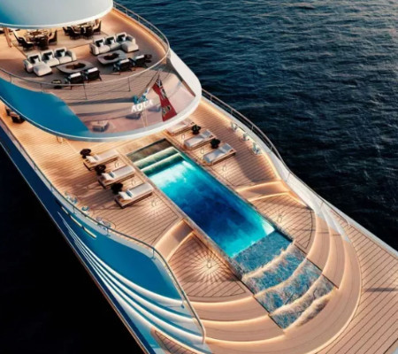Além de toda a tecnologia, o iate impressiona com seus interiores luxuosos. Entre as regalias, estão um amplo centro de saúde e bem-estar com academia, sala de hidromassagem e estúdio de ioga. Também há espaços de entretenimento interno e externo com uma sala de jantar formal para 14 pessoas, deques com vista, heliponto, piscina com borda infinita e spa.
