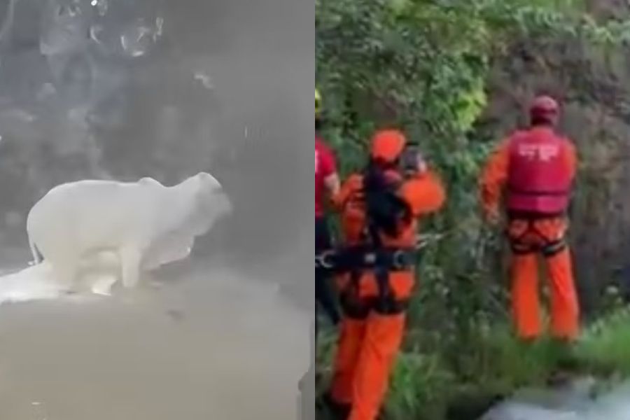 Com apoio da aeronove Arcanjo, bombeiros da cidade de Nova Ponte, Minas Gerais, resgataram um boi de raça nelore adulto, que estava preso na Cachoeira da Fumaça (23). A cachoeira, conhecida por ser um famoso ponto turístico, tem cerca de 45 metros de altura.