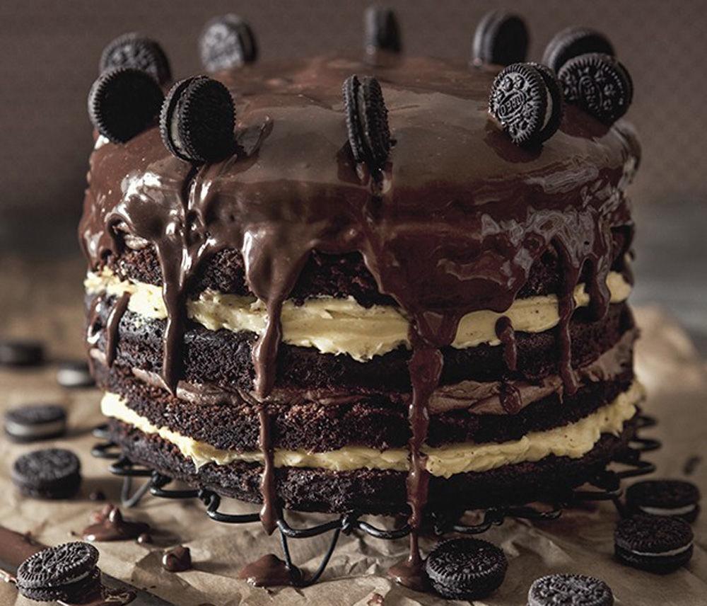 11 Derreta o chocolate com 70% de cacau juntamente com o creme de leite reservado. Despeje sobre o bolo e sirva decorado com os biscoitos.