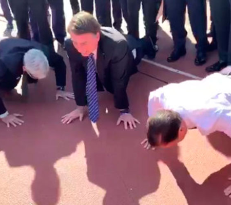 No vídeo, divulgado pela assessoria de Doria, Bolsonaro e o governador fazem 10 flexões em 20 segundos, acompanhados por jovens da Polícia Militar de São Paulo, na pista de atletismo do complexo.