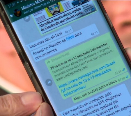 Em 24 de abril, quando pediu demissão, Moro apresentou ao Jornal Nacional uma troca de mensagens do dia anterior (23), na qual Bolsonaro enviou a ele um link de uma reportagem do site O Antagonista. A reportagem dizia que a PF estaria "na cola" de deputados aliados do governo.