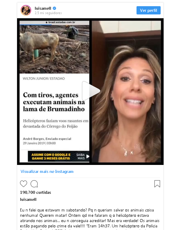 A ativista Luísa Mell fez uma denúncias nas redes sociais. Ela foi até Brumadinho, cidade mineira que foi atingida pelo rompimento de uma barragem de rejeitos da mineradora Vale na última sexta (25) e relatou que os animais presos na lama estão sendo sacrificados a tiro. E lamentou: “os animais estão pagando pelo crime da Vale”. Luísa Mell, que foi ao local para ajudar nos resgate dos bichos, conta ainda que foi foi impedida de embarcar no helicóptero da Polícia Federal.