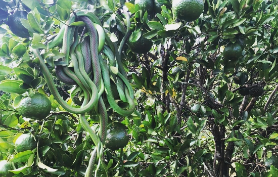 Em abril do ano passado, Telmo Santos registrou, no município de Santo Antônio da Patrulha (RS), um ‘cacho’ de cobras-verde penduradas sob os galhos de um pé de mexerica. A foto foi parar em um grupo no Facebook, na tentativa de entender qual fenômeno era aquele. O que ele não imaginava, porém, era que estava colaborando com a ciência: o comportamento compartilhado nas redes sociais foi descrito em uma nota científica de história natural na revista Herpetological Review, um periódico que reúne informações fundamentais para a compreensão da biologia das serpentes.