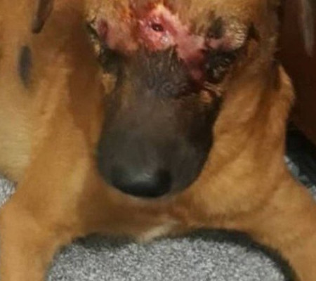 Foi nesse momento que uma bala atingiu sua cabeça, entrou ao lado da orelha e vazou pela parte frontal de seu crânio. Depois de ser atendido por um veterinário, o animal foi medicado, está em observação e passa bem, mas ainda sob risco de perder a visão.