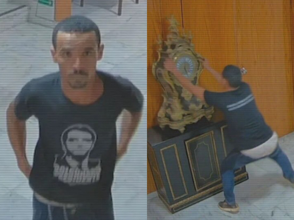 Quase às 16h, um novo atentado contra a cultura e a história: com uma barra de metal, um vândalo começa a perfurar uma obra de arte criada 60 anos atrás. São sete golpes em um quadro do grande pintor brasileiro Di Cavalcanti.