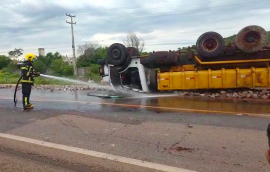 Um caminhão-caçamba caregado de pedras capotou na tarde desta terça-feira, dia 1º de março, no Km 422 da rodovia federal BR 407, no perímetro urbano de Picos, no Sul do Piauí. Dois homens e uma mulher ficaram feridos após um caminhão-caçamba tombar.