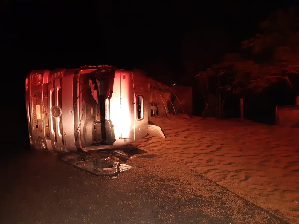 Segundo a Polícia Rodoviária Federal (PRF) o acidente, que deixou o motorista do veículo pesado levemente ferido, aconteceu por volta das 19h30 no km 306 da BR-222, próximo ao povoado Acoque, quando a carreta carregada de soja tombou sobre a rodovia, derramou a carga e interditou uma das faixas.