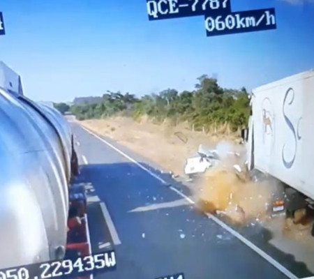 O acidente aconteceu no sábado (3), por volta das 7h. Nas imagens é possível ver quando o carro de passeio tenta uma ultrapassagem e acaba batendo de frente contra o caminhão que trafegava no sentido contrário.