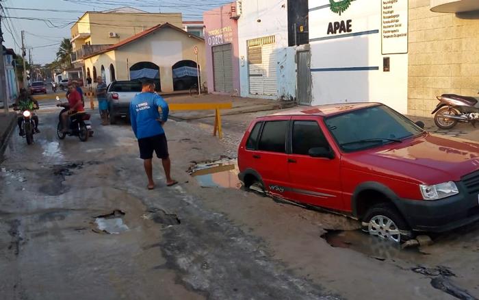 Um veículo caiu em um buraco na Rua Patriotino Lages em frente ao prédio onde funciona a APAE no centro da cidade de Esperantina. O motorista não viu um buraco causado por um vazamento na tubulação da Agespisa. As informações são do O Olhar.
