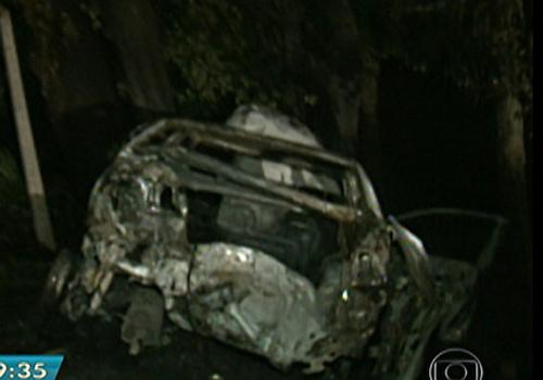 Depois do atropelamento, a perseguição continuou na Rodovia Henrique Eroles, em Itaquaquecetuba. Após uma curva, os homens perderam o controle e bateram em uma árvore. A equipe do Bom Dia São Paulo encontrou o carro ainda em chamas.