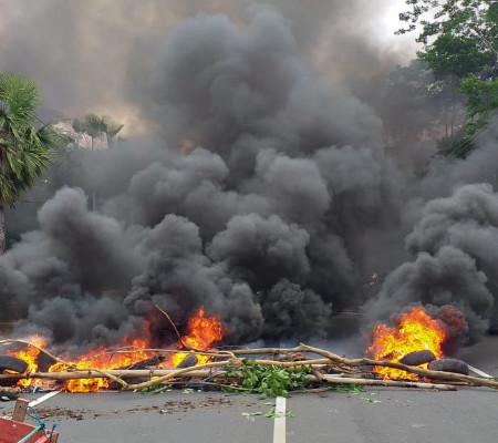 Carroças, restos de podas de árvores e pneus estão sendo incendiados e interditam a pista.