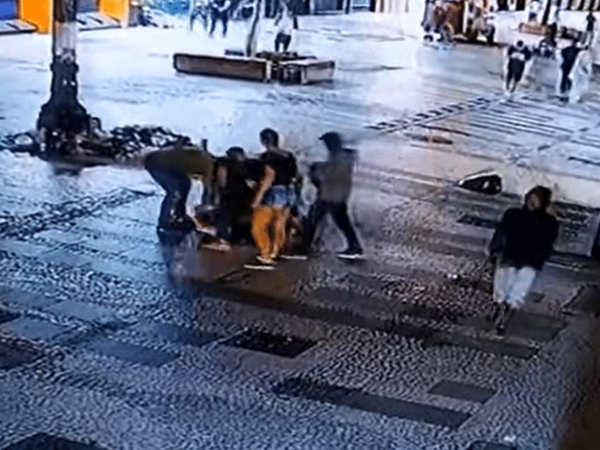 - A ação foi gravada por câmeras de segurança no local e mostram que as vítimas foram jogadas no chão, agredidas, um deles é chutado e tem até uma peça de roupa levada segundos depois;