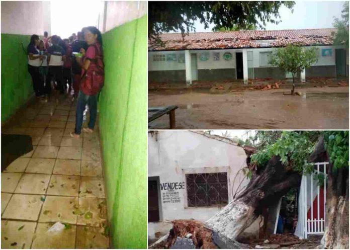 De acordo com informações, várias escolas ficaram destelhadas devido a força do vento e os alunos passaram um grande susto, amontoados nos corredores da escola temendo o pior.