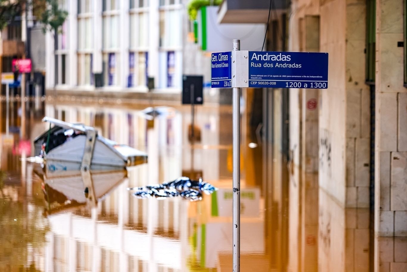 Bombeiro se mobiliza em resgate na tragédia das chuvas do Rio Grande do Sul. Em um helicóptero, ele observa um resgate em jet sky, enquanto a rua está totalmente alagada (Foto: Facebook do Governo do Rio Grande do Sul)Agravamento da situação