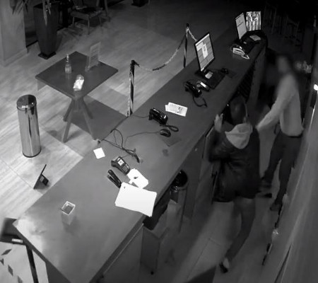 Em seguida, o cliente se aproxima mais do balcão e começa a apontar o dedo para o recepcionista, que segue arrumando objetos na mesa. O cliente vai em direção à porta, mas volta, pega um cone que estava isolando o balcão e tenta acertar o funcionário do hotel.