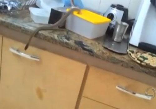 O animal passeia tranquilamente em cima da pia. Demonstrando que está tão à vontade, ela passa entre as vasilhas à procura de algo. O morador contou ter levado um susto ao se deparar com a cobra na cozinha da casa dele. Ele avalia que o animal deve ter saído de um lote abandonado ao lado da residência dele. Um vizinho chamou a equipe do Corpo de Bombeiros, que retirou a cobra do local.
