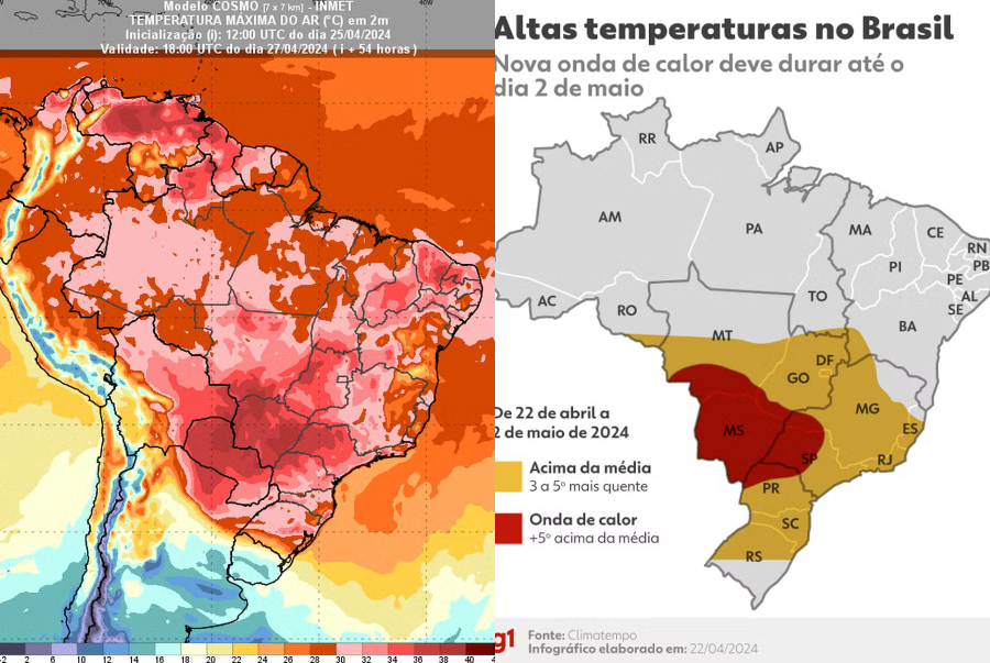 BLOQUEIO ATMOSFÉRICO: No Rio de Janeiro, os termômetros podem chegar a 39°C nos próximos dias, enquanto em Cuiabá a máxima pode alcançar 37°C. A onda de calor é causada por uma área de alta pressão que atua como um bloqueio atmosférico, impedindo a chegada de frentes frias no Centro-Oeste e mantendo o ar seco e quente.