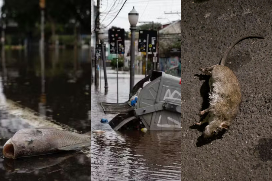 Peixe, rato e lixo deixados pelas enchentes no RS | Foto: Montagem/MeioNews