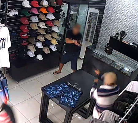 No vídeo das câmeras de segurança é possível ver o momento do tiroteio. Uma porta de vidro de um armário ficou destruída. Depois que os três homens já estavam no chão, o comerciante atirou mais algumas vezes, deu um chute e pegou a arma que um deles usava.