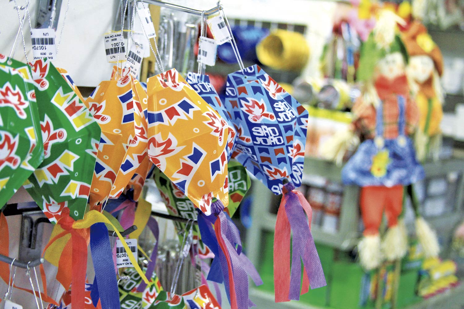 Para quem organiza essa seção de produtos, a estratégia é deixar tudo com o aspecto junino, desde acessórios a objetos de decoração.