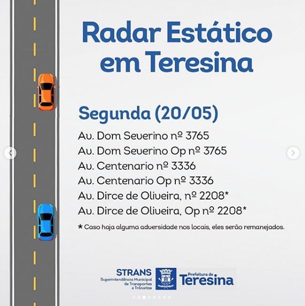 A Prefeitura de Teresina divulgou na manhã desta segunda-feira (20/05), a localização dos radares durante toda essa semana na capital. Para dar mais transparência aos teresinenses, a lista com a localização dos radares é sempre divulgada no site e nas redes sociais, já que a presença dos aparelhos é importante para diminuir e prevenir o número de acidentes, assim como dar maior fluidez ao trânsito.