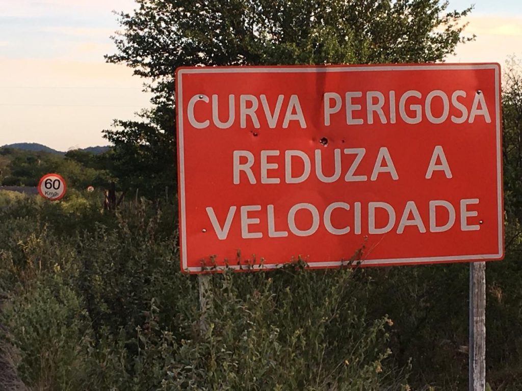 Ao chegar na curva, é possível observar que existe a sinalização por meio de placas, informando o perigo da curva e orientando aos condutores que reduzam a velocidade de 60 para 40km. Os letreiros estão visíveis para os condutores.