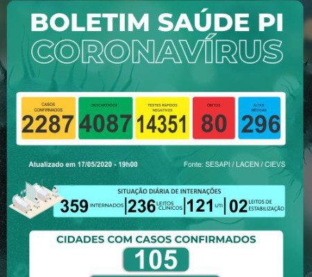 O boletim epidemiológico divulgado na noite deste domingo (17/05) pela Secretaria de Saúde do Piauí registrou que os casos confirmados de coronavírus saltaram de 2.252 para 2287 no Estado. Os óbitos saíram de 72 para 80, sendo cinco pacientes de Teresina e três do interior do estado.