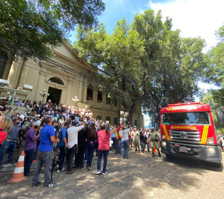 O corpo do ex-prefeito Firmino Filho está em cima do caminhão do Corpo de Bombeiros para o cortejo em algumas zonas de Teresina. A Polícia Militar está presente para realizar a escolta já que muitos populares querem acompanhar o cortejo para prestar as últimas homenagens ao ex-gestor. A saída de Firmino da funerária foi marcada por muita emoção e aplausos. Agentes da Strans ajudam a controlar o trânsito.