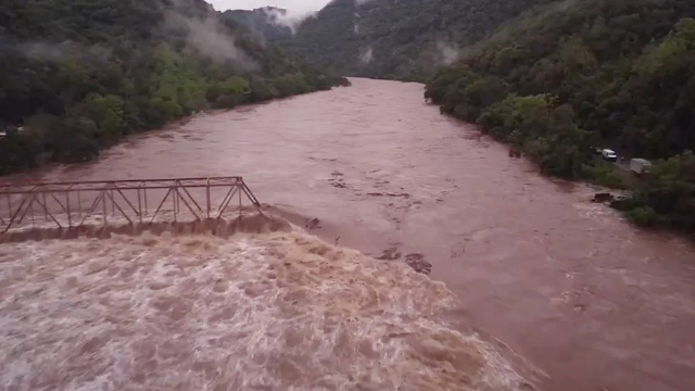 O temporal que atinge o Sul do país desde o último domingo (3) fez a correnteza de um rio na Serra Gaúcha derrubar nesta segunda-feira (4) uma ponte histórica que liga as cidades de Farroupilha e Nova Roma do Sul. Força do Rio das Antas derrubou toda a estrutura. Segundo a Prefeitura de Farroupilha, a ponte de 120 metros distância e 22 de altura foi atingida após o aumento do nível da água.