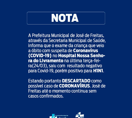 A Secretaria Municipal de Saúde da cidade de José de Freitas, divulgou através das redes sociais neste sábado (28), uma nota informando que o exame da criança que veio a óbito com suspeita de Coronavírus (COVID-19) no Hospital Nossa Senhora do Livramento, na última terça-feira (24), testou negativo para Covid-19, porém positivo para o vírus influenza H1N1.