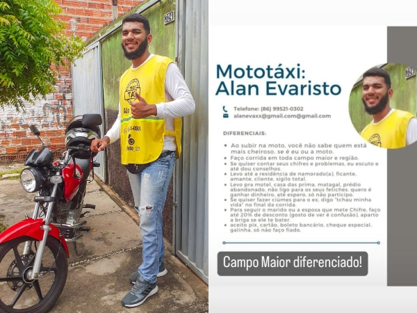 “Ao subir na moto, você não sabe o que está mais cheiroso, se é eu ou a moto”. É o que diz somente um dos ‘diferenciais’ do currículo do mototaxista do município de Campo Maior, Alan Evaristo, que já atua há quase um ano na região no seguimento. A brincadeira, com intuito de chamar a atenção dos clientes, viralizou nas redes sociais.